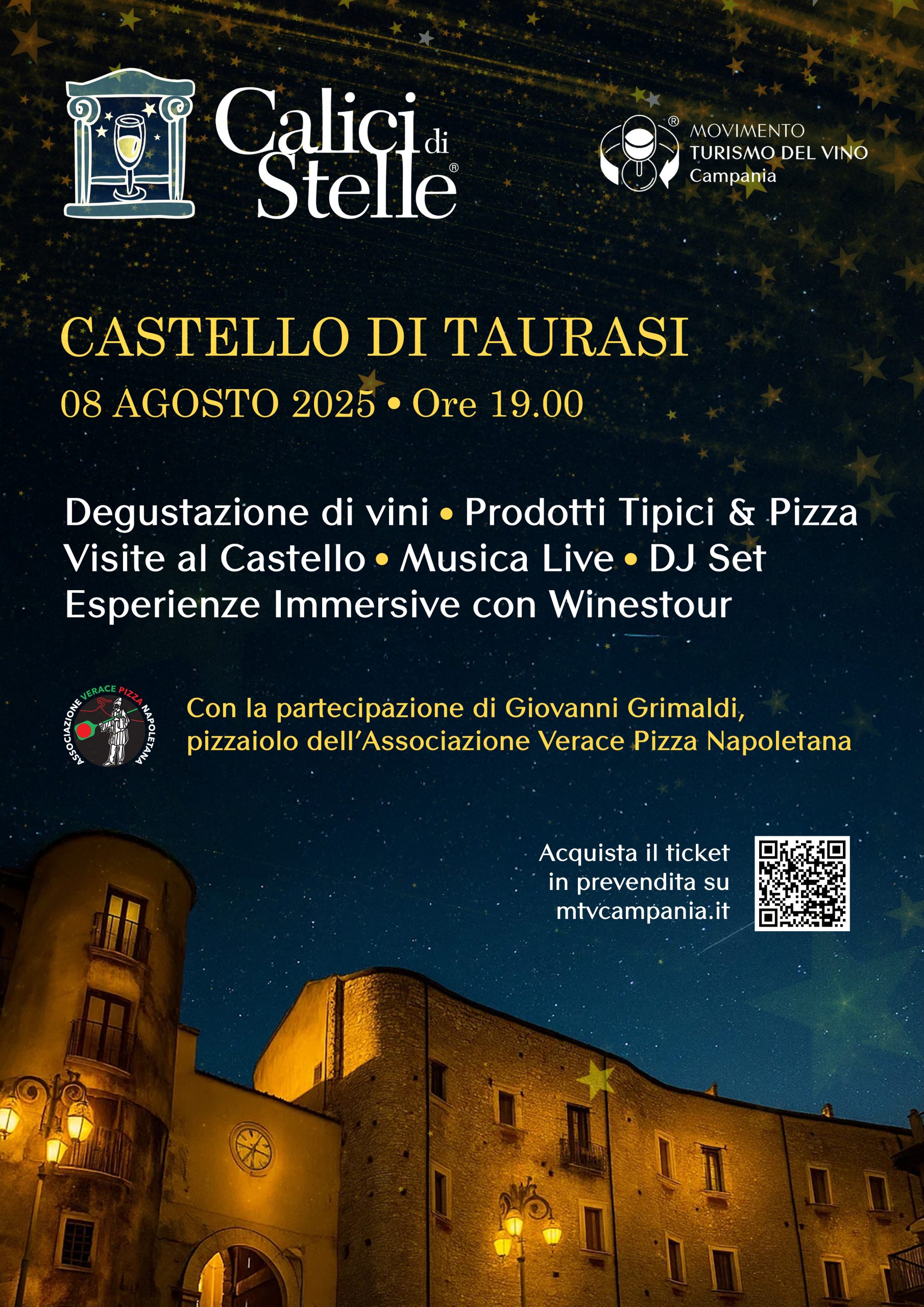 Una notte magica tra i profumi del vino, le eccellenze gastronomiche e l’incanto del patrimonio culturale: Calici di Stelle torna nella splendida cornice del Castello Marchionale di Taurasi, per un’esperienza multisensoriale indimenticabile. - Degustazioni di vini delle cantine locali - Assaggi di prodotti tipici irpini e pizza - Musica live per tutta la serata - Visite guidate al castello, tra storia e leggenda - Esperienze immersive in realtà virtuale con Winestour Con la partecipazione di Giovanni Grimaldi, pizzaiolo dell'Associazione Verace Pizza Napoletana, che delizierà il pubblico con le vere pizze napoletane preparate secondo tradizione. Un evento imperdibile che celebra le stelle, il gusto e la cultura del nostro territorio. Ingresso con ticket – Dalle ore 19:00 fino a notte inoltrata